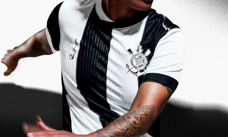Em gola careca, a nova terceira camisa do clube apresenta listras verticais em preto e branco por toda a peça, com as mangas de cada cor. O escudo do clube foi redesenhado para refletir a dualidade das listras corintianas, com um lado preto e o outro branco. Outra novidade é o swoosh (logo da Nike) duplo, que faz referência à aceleração do futebol feminino globalmente. O shorts também segue o design em preto e branco, enquanto as meias listradas completam o uniforme.