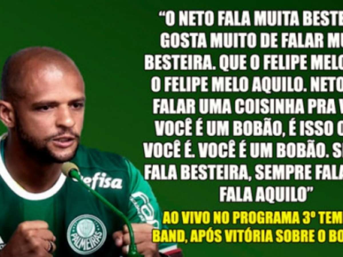 Resolvemos relembrar as frases de impacto de Felipe Melo, desde a sua apresentação ao Palmeiras até o clássico de ontem, contra o Santos. Nesses pouco mais de 2 meses, o Pitbull atacou o apresentador e comentarista Neto, o vice-presidente de comunicação do Flamengo Antonio Tabet, a torcida do Peixe e até prometeu dar tapa na cara de uruguaio. Confira na nossa galeria o 'top 10' das declarações do volante alviverde.