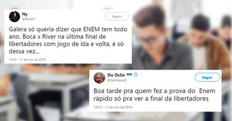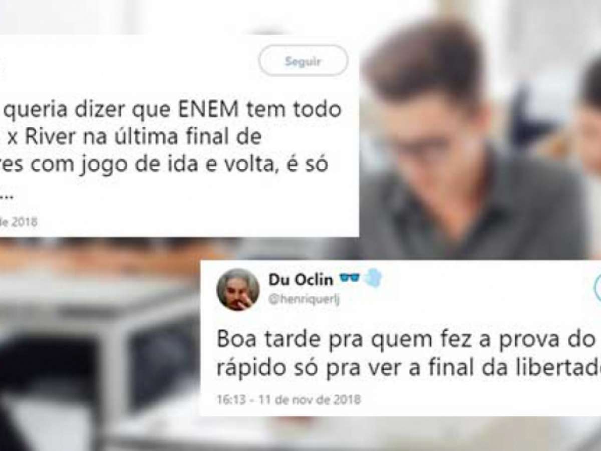 O adiamento da primeira partida da final da Libertadores devido às fortes chuvas que atingiram Buenos Aires no sábado causou uma situação indesejada para os candidatos do Enem que desejavam assistir ao duelo entre Boca x River. Isso porque os estudantes que precisaram das 5 horas disponíveis para resolver a prova, dificilmente chegaram em casa a tempo de acompanhar parte do jogão que terminou empatado em 2 a 2.