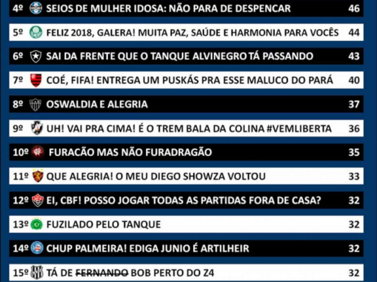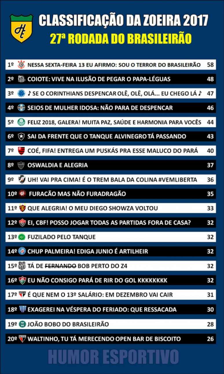 PUBLICIDADE Capa Esportes LANCE! Classificação da Zoeira - 27ª rodada do Brasileirão Open bar de biscoito, seios de mulher idosa e 13º salário. Confira como ficou o campeonato com uma dose de bom humor Por: HUMOR ESPORTIVO / Humor Esportivo 13 out 2017 - 11h53 Compartilhar Exibir comentários Classificação da Zoeira Foto: Humor Esportivo Compartilhar TAGS LANCE! Esportes Publicidade