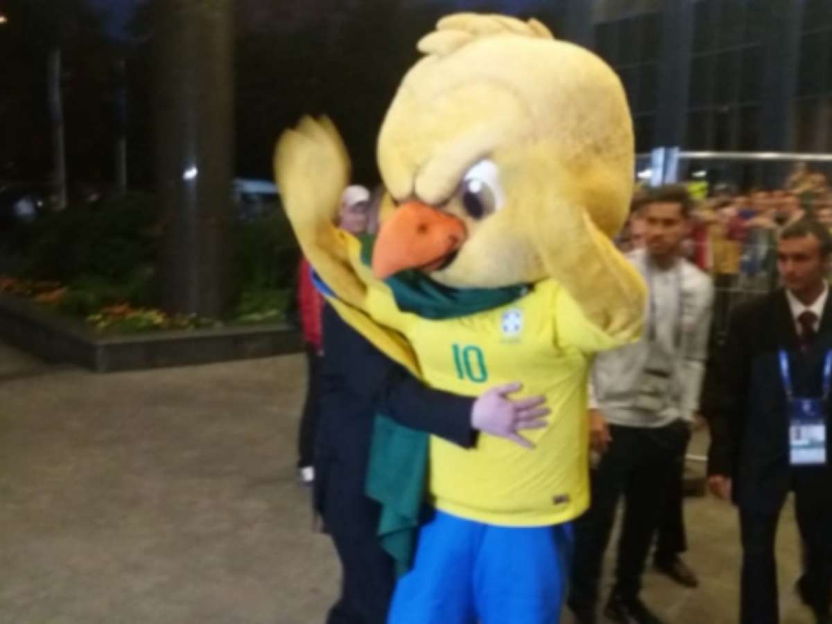 Assim como fizeram na chegada a São Petersburgo, na última semana, a torcida brasileira cantou e vibrou com a chegada dos jogadores. Empolgado com a festa, o mascote do Brasil, Canarinho, chegou a ser "enquadrado" pelos seguranças depois de escalar uma grade.