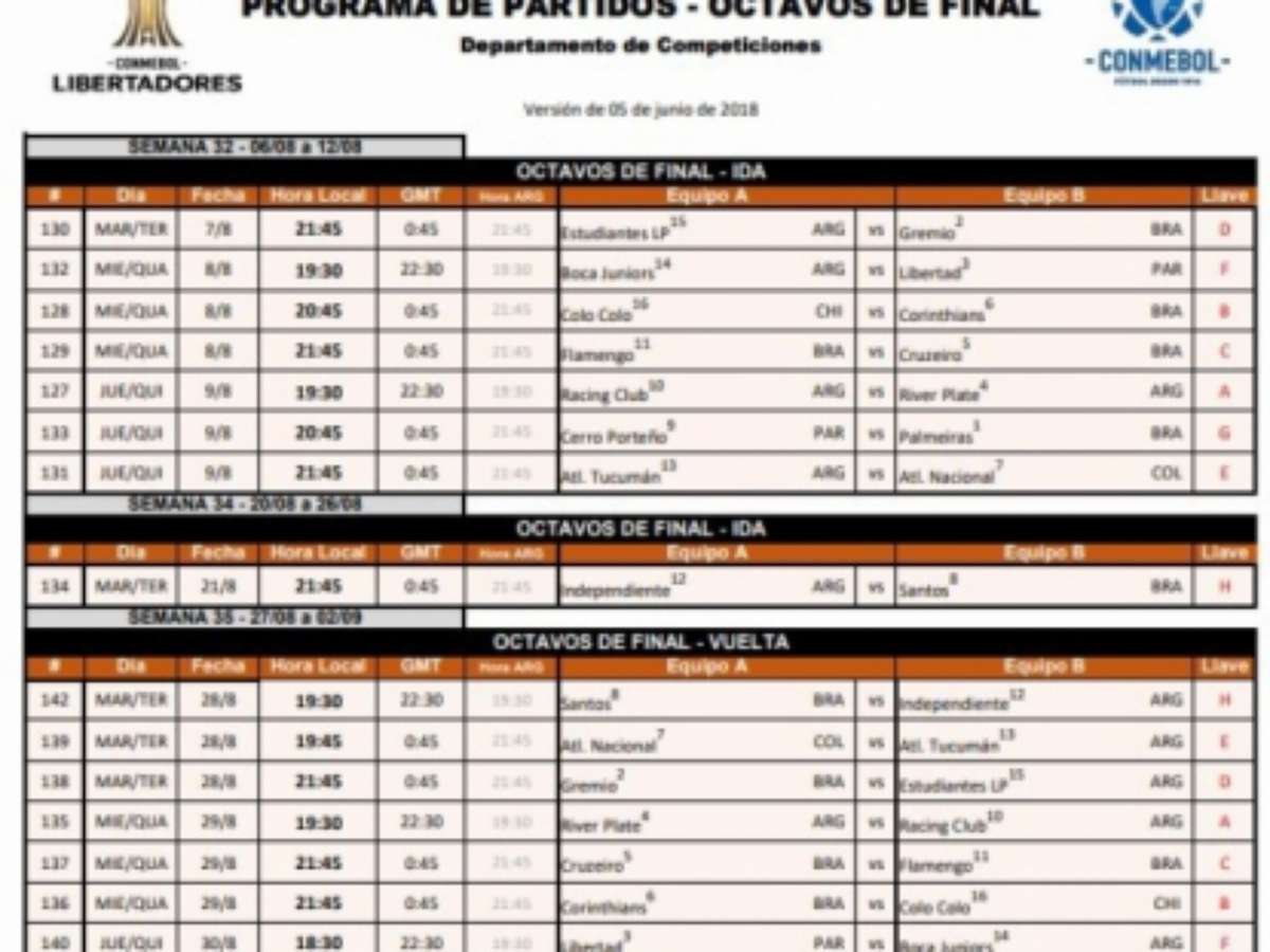 A Conmebol divulgou no início da tarde desta terça-feira as datas e horários dos oito confrontos de ida e volta das oitavas de final da Libertadores. Corinthians, Cruzeiro, Flamengo, Grêmio, Palmeiras e Santos são os brasileiros que ainda seguem no torneio continental.