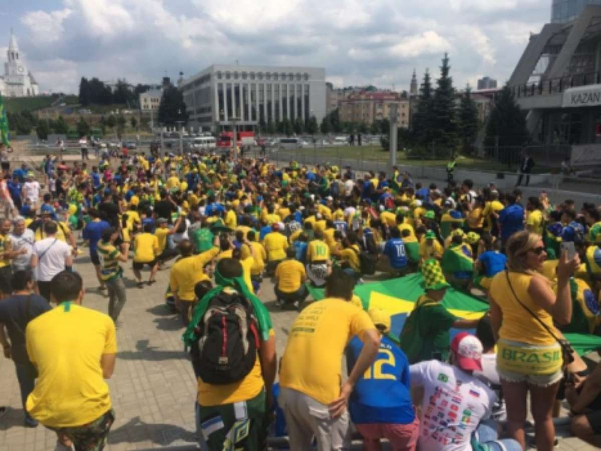 No meio da multidão em verde amarelo, um torcedor com a camisa da Bélgica, adversário nas quartas, chamou a atenção. Já duas russas ergueram cartazes pedindo para Neymar não ir embora do país e jogar pelo Rubin Kazan, maior clube da cidade.