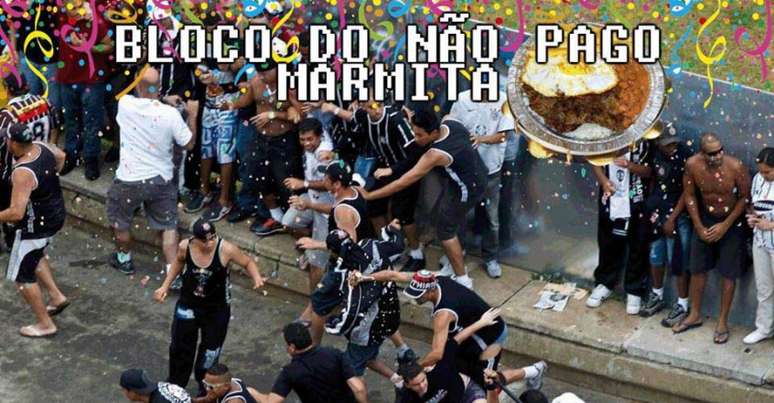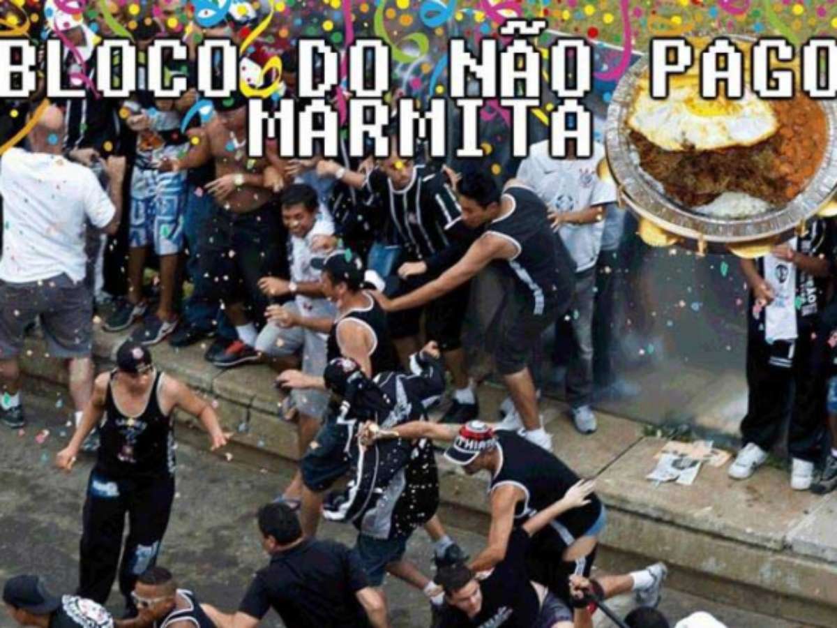 Em uma brincadeira no Facebook, o perfil Tv Alviverde ironizou a dívida do Corinthians com uma empresa de marmitas - fato que gerou bloqueio nas contas do clube no final do ano passado - e criou um evento fictício convocando os torcedores do Timão para o 'Bloco do não pago marmita' no próximo sábado, 17 de fevereiro, no Parque São Jorge.