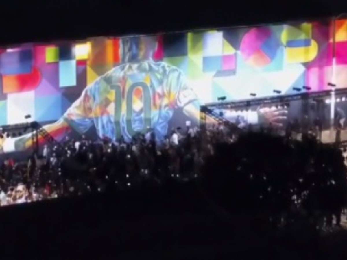 O craque inaugurou nesta terça um mural gigante na cidade americana e aproveitou para bater uma bolinha no local