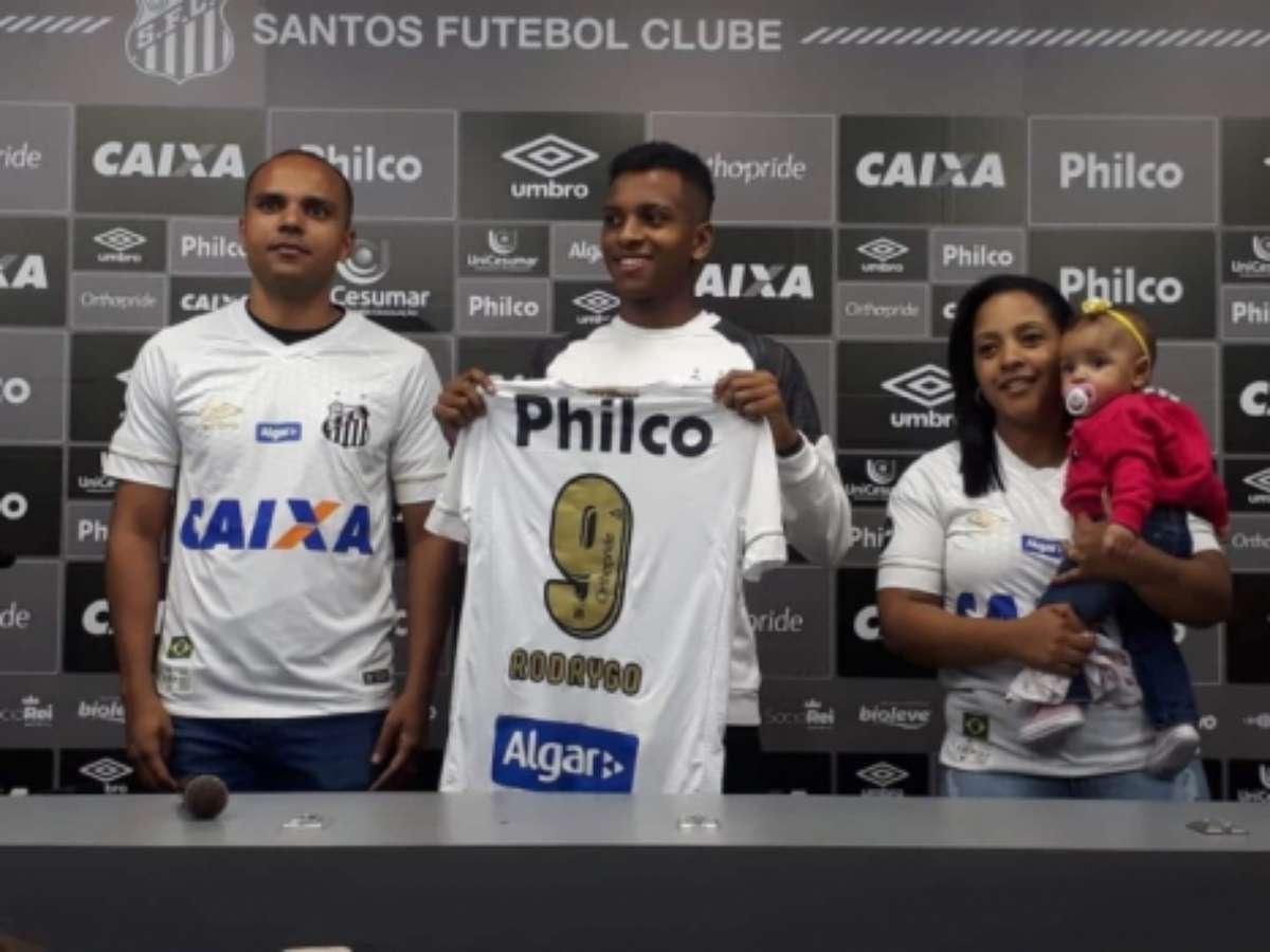 Rodrygo é o novo camisa 9 do Santos. O jogador de 17 anos utilizava a 43 e assumiu a tradicional numeração de atacante na tarde desta quinta-feira, em uma homenagem durante a coletiva de imprensa, no CT Rei Pelé.