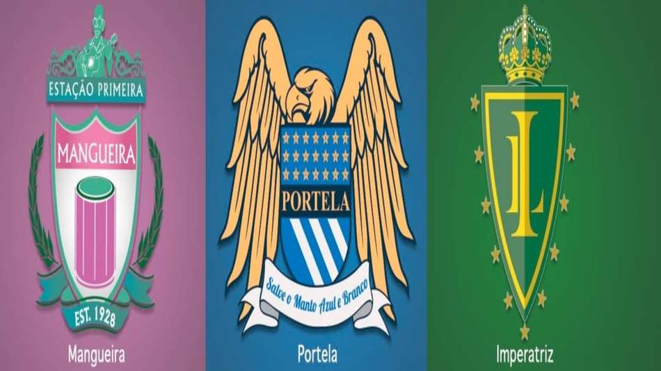 Escudos das escolas de samba misturados com os de clubes de futebol
