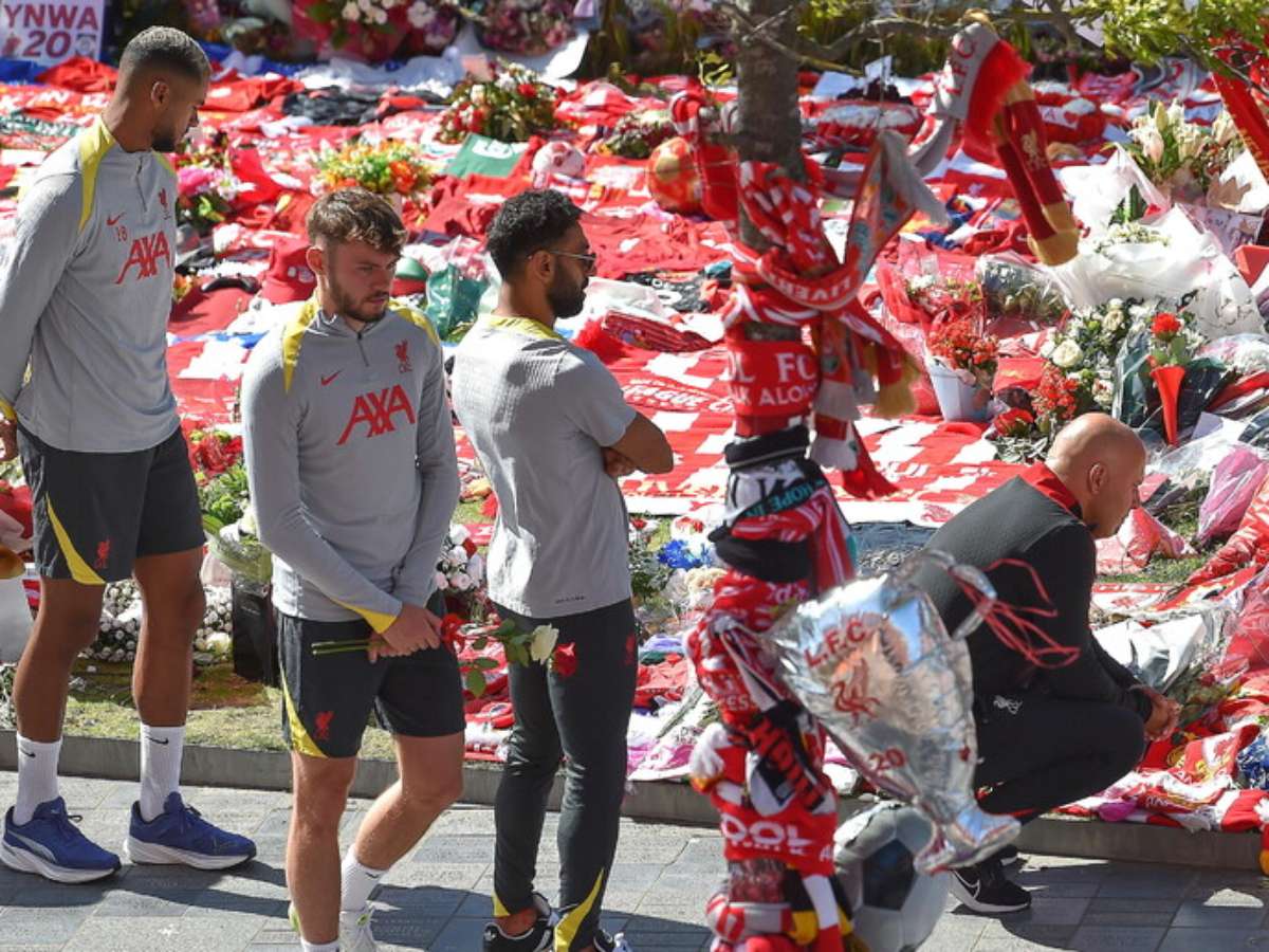 Na oportunidade, os jogadores depositaram flores em uma via recheada de camisas, cachecóis, bandeiras e balões de coração colocadas por torcedores em homenagem a Jota, que defendia o clube britânico, e Silva, do Penafiel.