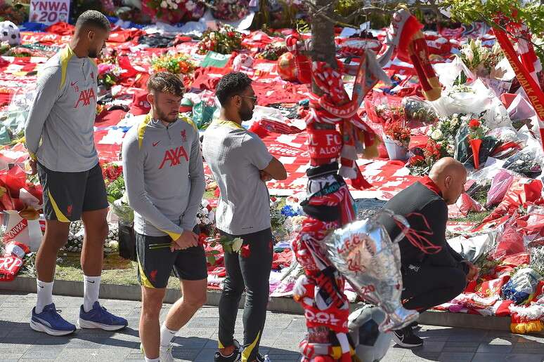 Os jogadores e a comissão técnica do Liverpool prestaram homenagens nesta sexta-feira (11) em Anfield, na Inglaterra, aos irmãos Diogo Jota e André Silva, mortos em um acidente de carro na Espanha.