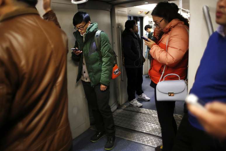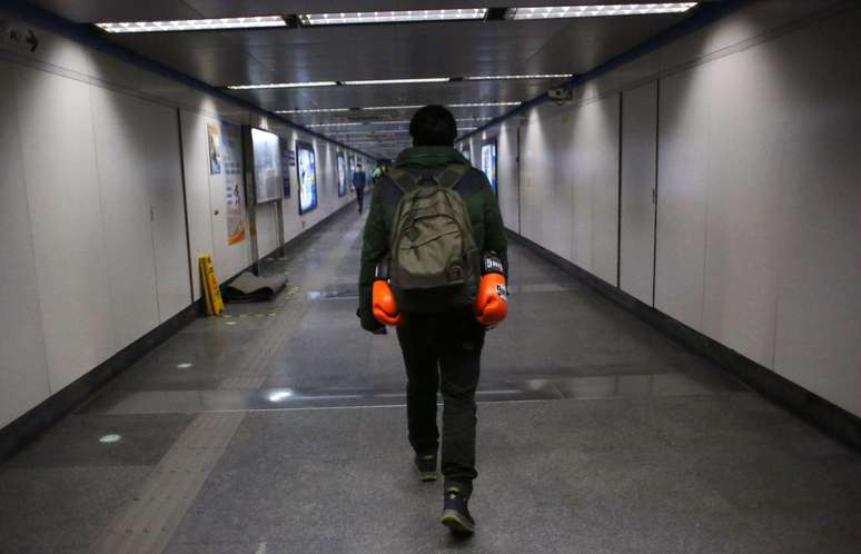 Vin Huang usa o celular enquanto viaja no metrô a caminho de uma aula de boxe no Clube das Princesas em Xangai.