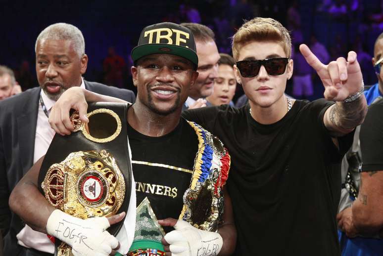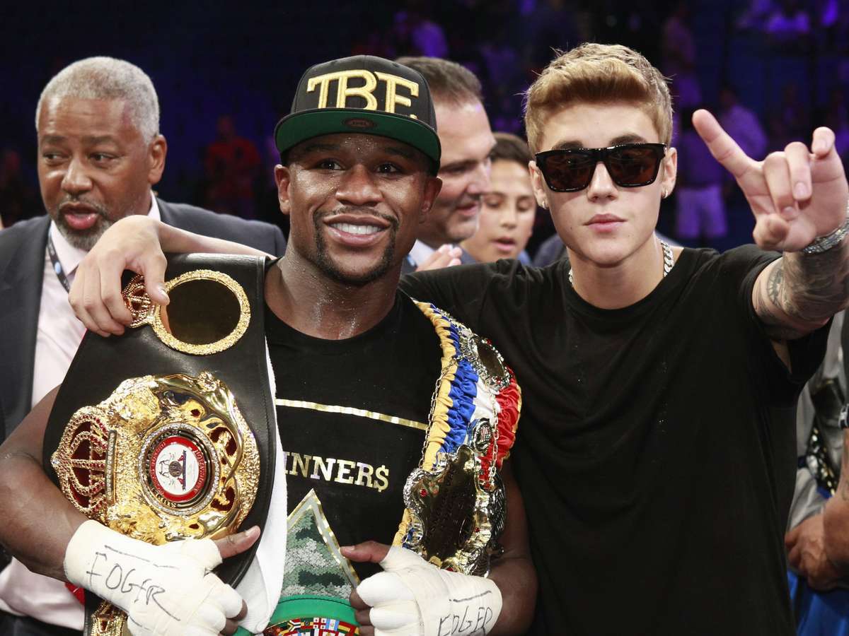 Uma das principais atrações do evento, Justin Bieber ri em cima do ring após entrar ao lado de Floyd Mayweather