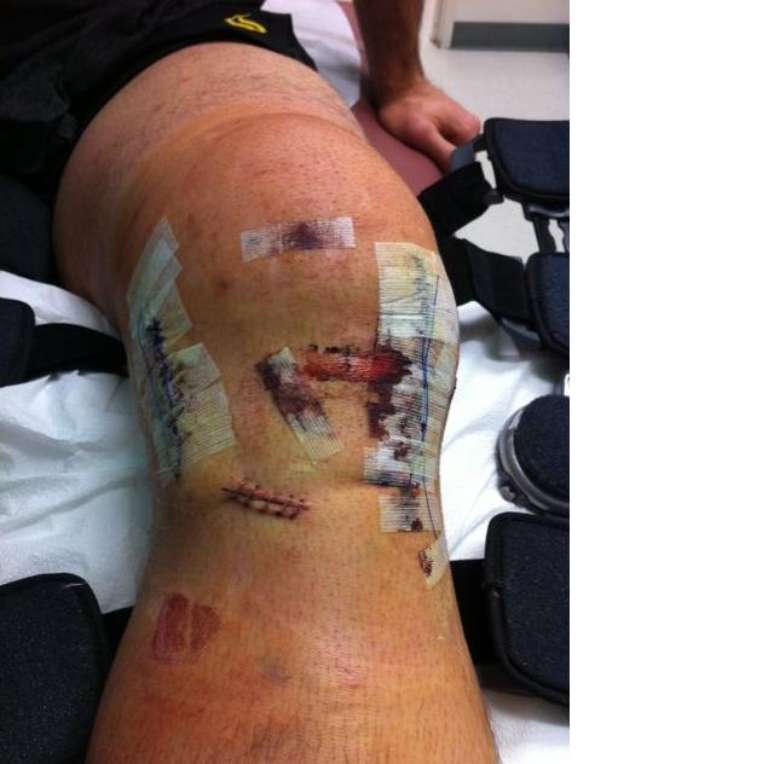Questionado na rede social, Griffin respondeu esclarecendo que se submeteu a uma operação no ligamento colateral medial da região. A imagem mostra o joelho do atleta com vários curativos, feridas e cicatrizes.