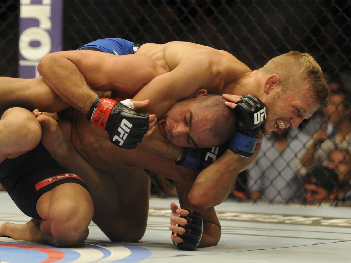 TJ Dillashaw castiga Renan Barão em vitória que lhe garantiu o cinturão dos galos (Foto: Reuters)
