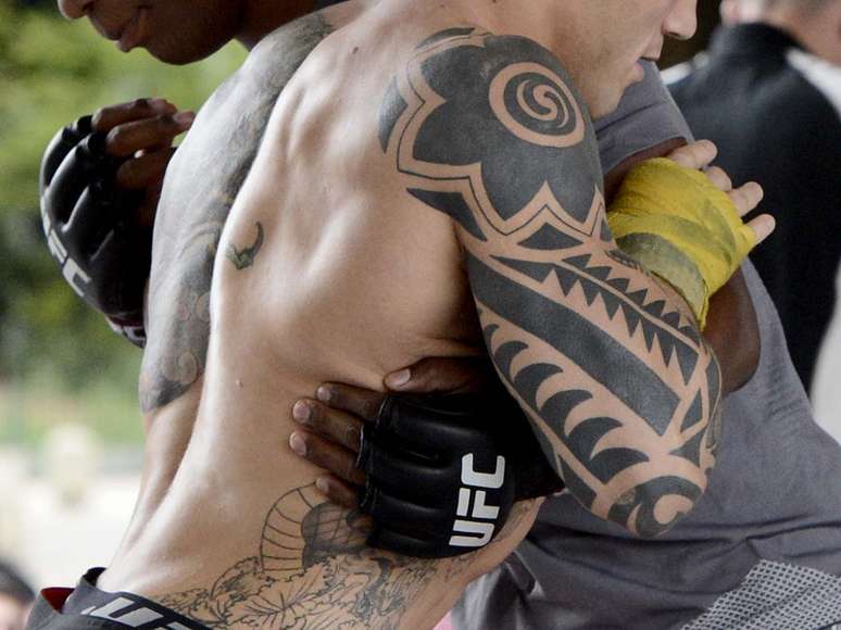 Os lutadores que disputarão o UFC São Paulo no sábado realizaram na quarta-feira um treino aberto no centro de São Paulo e chamaram a atenção pelas inúmeras tatuagens de alguns deles. Confira, a seguir, alguns dos principais desenhos que os atletas possuem estampados em seus corpos - como o braço e as costas do médio Daniel Sarafian (foto):