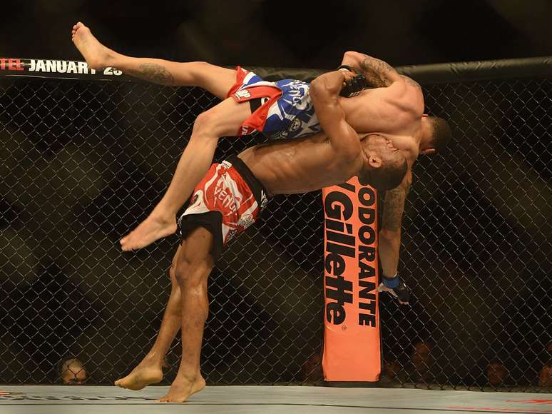 O UFC São Paulo começou com festa brasileira. Neste sábado, no Ginásio do Ibirapuera, o piauiense Francisco Massaranduba derrotou CJ Keith, americano que teve dificuldades para bater o peso e chegou a ficar pelado no palco para tentar superar a balança na pesagem da sexta-feira. Em combate pelos leves, o brasileiro conseguiu sua finalização no segundo round e festejou muito sua segunda vitória na franquia de MMA.