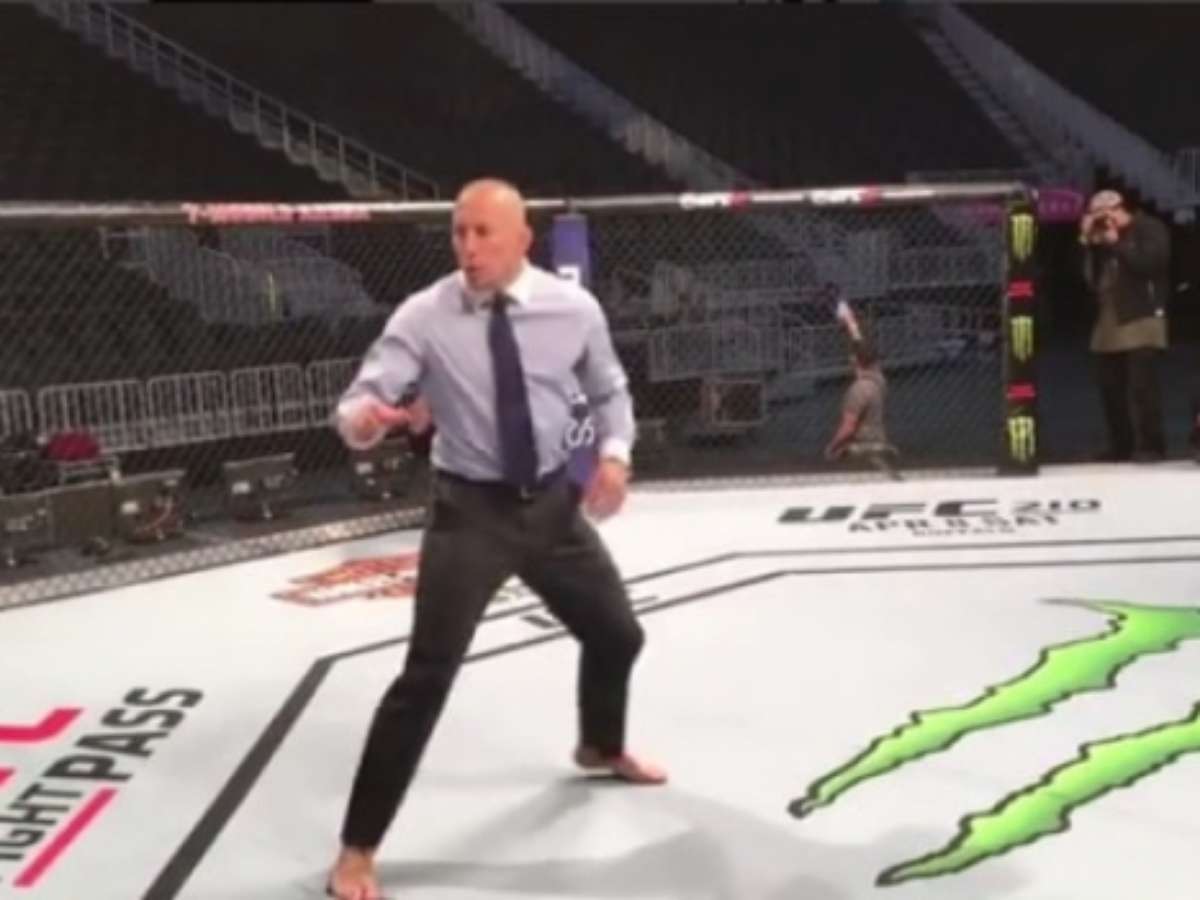 O octógono montado é parte do UFC 209, que acontece neste sábado, em Las Vegas (EUA). O canadense, além de entrar no cage, se movimentou e esboçou alguns movimentos de luta, mostrando empolgação pelo retorno.