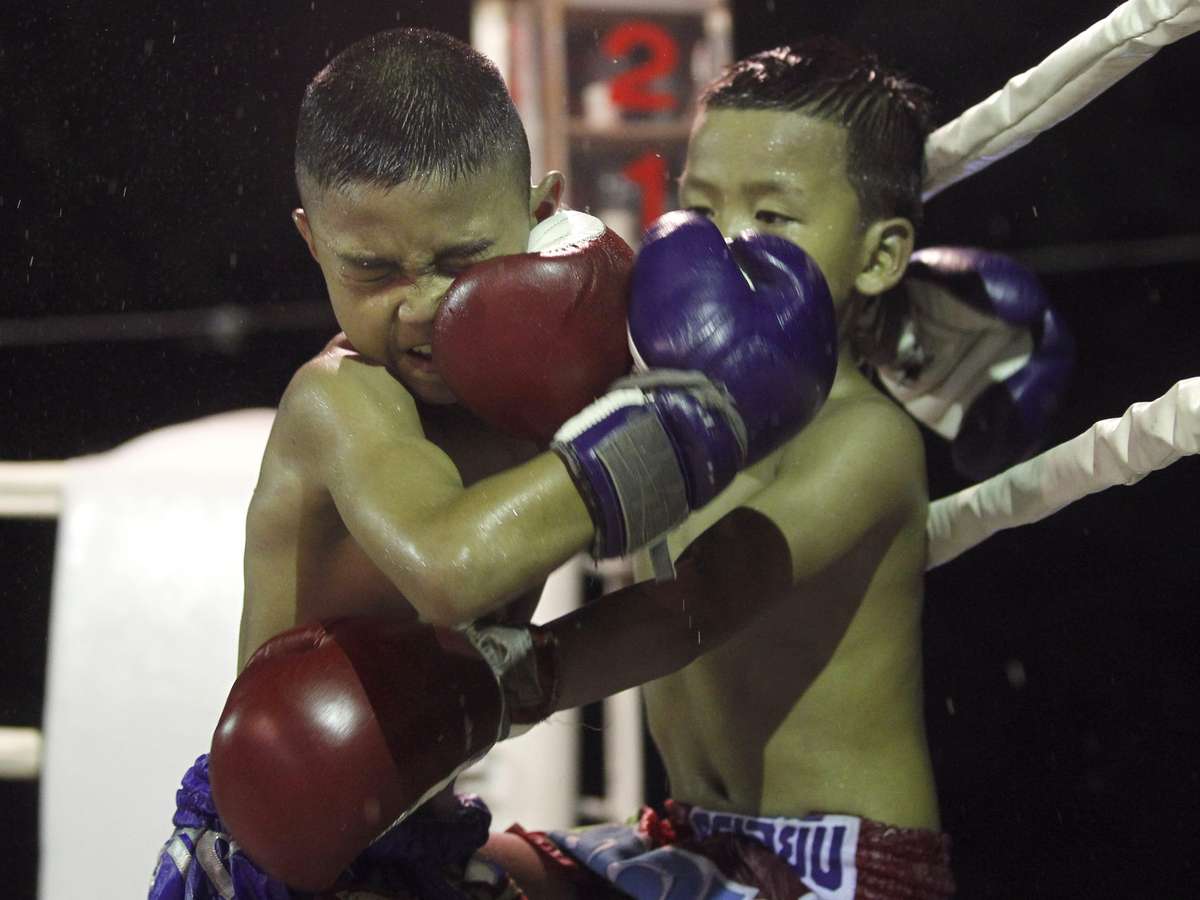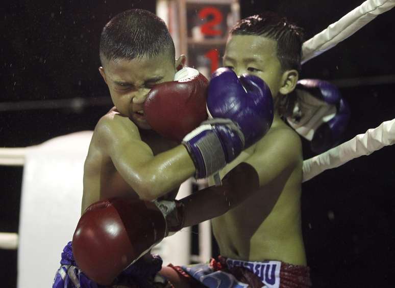 Na cultura tailandesa, muay thai é parte da vida e do cotidiano. Meninos e meninas treinam desde muito novos a arte marcial e não é incomum que as crianças se enfrentem diante de centenas de espectadores, em ringues por todo o país. Em duelo realizado em Bangkok, Sueamob Sidkrujiab (à dir.) atinge o adversário Chalarmkao Lukbanyai (à esq.) durante combate