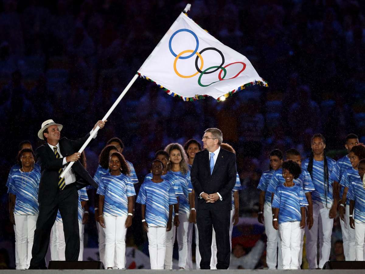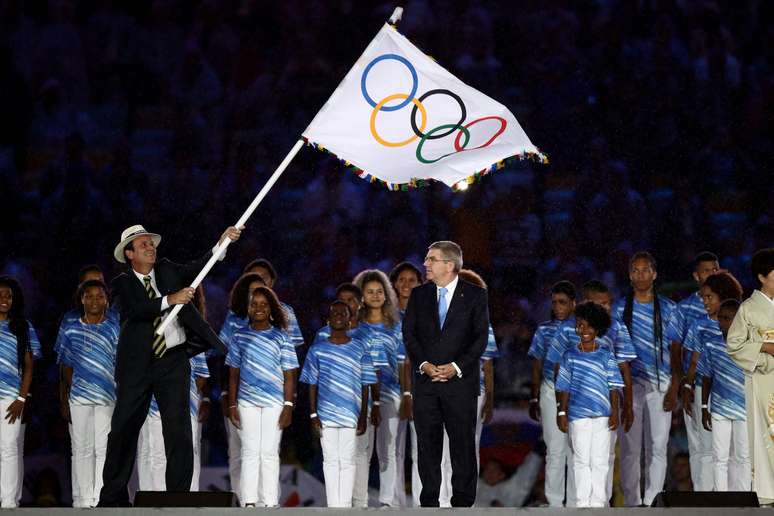 O prefeito do Rio de Janeiro, Eduardo Paes, empunha a bandeira olímpica