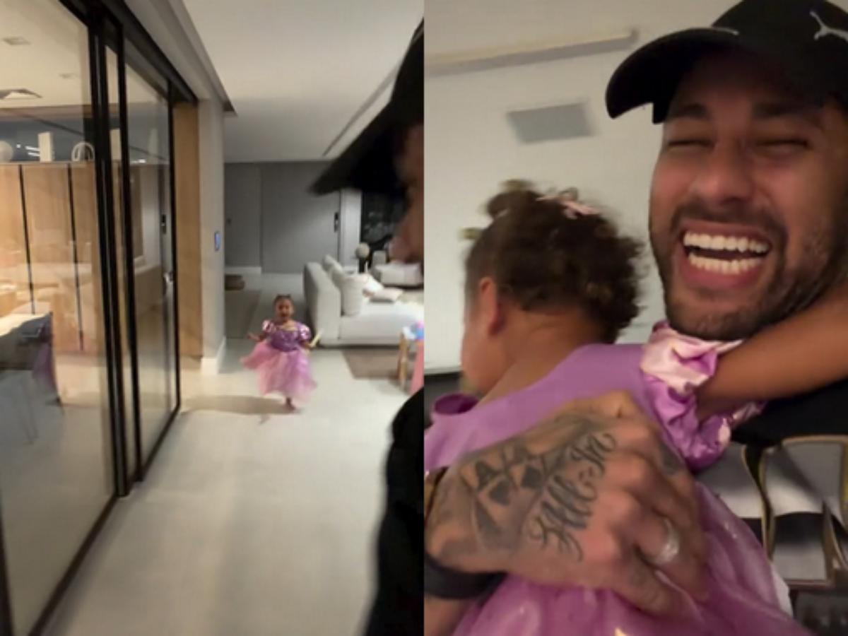 Logo em seguida, Mavie aparece atrás, seguindo o pai. Ela se assustou com a encenação e chora, pedindo colo. Neymar, então, abraça a menina aos risos e pede que ela se acalme.