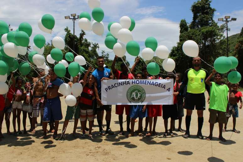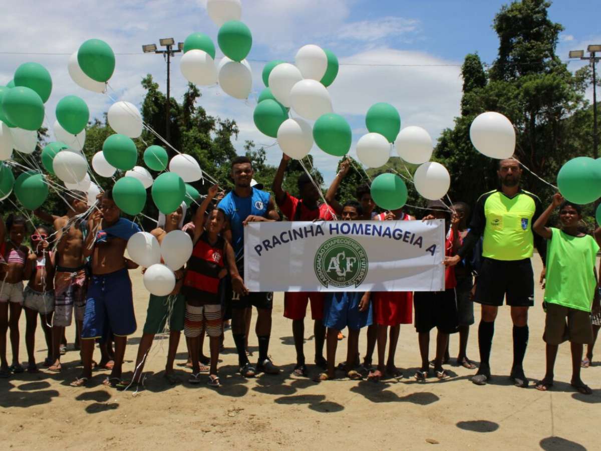 Mas, antes mesmo dos gols (2 x 2) e da entrega do troféu ao Pracinha, que venceu nos pênaltis, alguns chegaram às lágrimas quando os times se perfilaram no campo e lembraram da tragédia. Os jogadores e crianças da comunidade soltaram 71 balões verdes e amarelos e estenderam uma faixa em homenagem à Chapecoense.