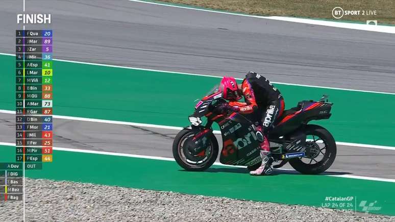 Aleix Espargaró fazia um fim de semana perfeito na Catalunha e era tido como favorito para vencer. Na primeira volta, no entanto, Fabio Quartararo o ultrapassou e abriu uma boa vantagem. Vendo o francês longe, o piloto da Aprilia parecia se conformar com a segunda posição — a qual ele batalhava contra Jorge Martín para manter. Só que tudo foi por água abaixo quando cruzou a linha para completar a última volta.