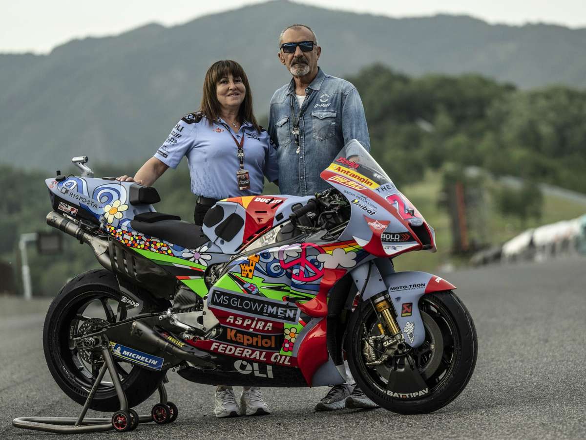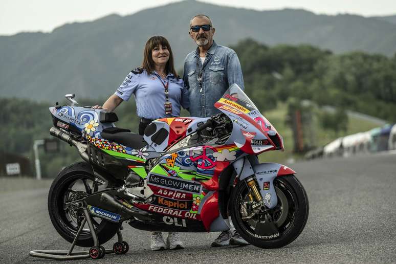 A Gresini apresentou um novo layout das motos de Enea Bastianini e Fabio Di Giannantonio neste sábado (28). A equipe chefiada por Nadia Padovani mostrou um design 'paz e amor' para as ações de sua corrida em casa, em Mugello, no GP da Itália de MotoGP.
