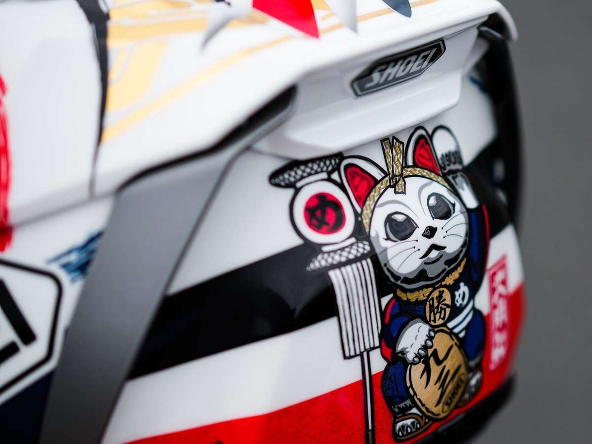 "Agora, mais do que, já que não visitamos o Japão desde 2019, sempre dou aos amigos da Shoei a possibilidade de desenharem um capacete um pouco ao gosto deles, pois sempre fazemos com a Dave Designs, que é um designer que trabalha comigo, espanhol, e aqui nós trabalhamos com eles. Eles me desenharam um gato da sorte, um ritual que se faz com alguns potes da sorte também, e disse: 'Bom, tudo é de sorte, manda porque isso anda fazendo falta, não tivemos nos últimos anos'", contou Marc.