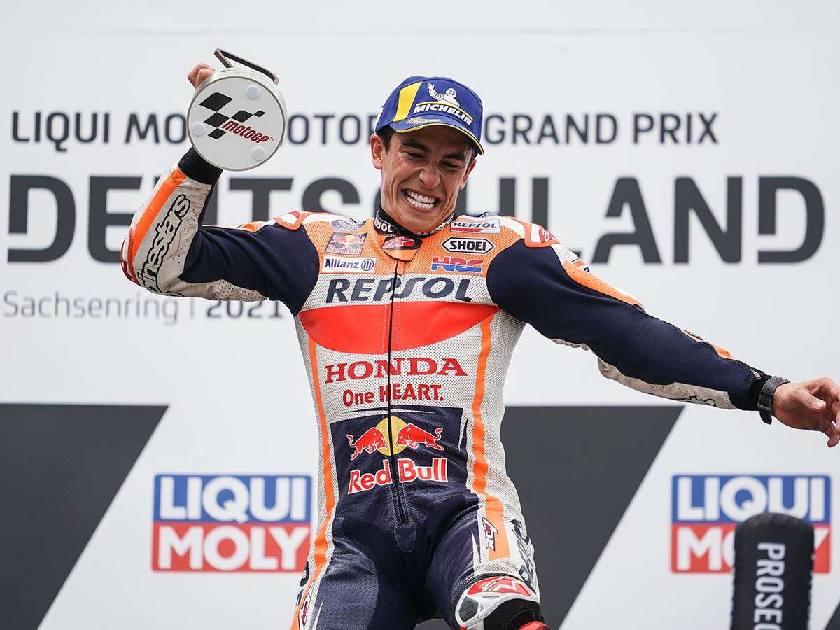Foi um domingo emocionante para Marc Márquez. O espanhol, que ainda se recupera de uma lesão, vive uma temporada difícil e longe dos holofotes, mas o GP da Alemanha foi diferente. Correndo em uma pista em que só ele vence desde 2013 na MoitoGP, o multicampeão mostrou do que é feito e conquistou a vitória, depois de 581 dias. O último triunfo havia sido em novembro de 2019.