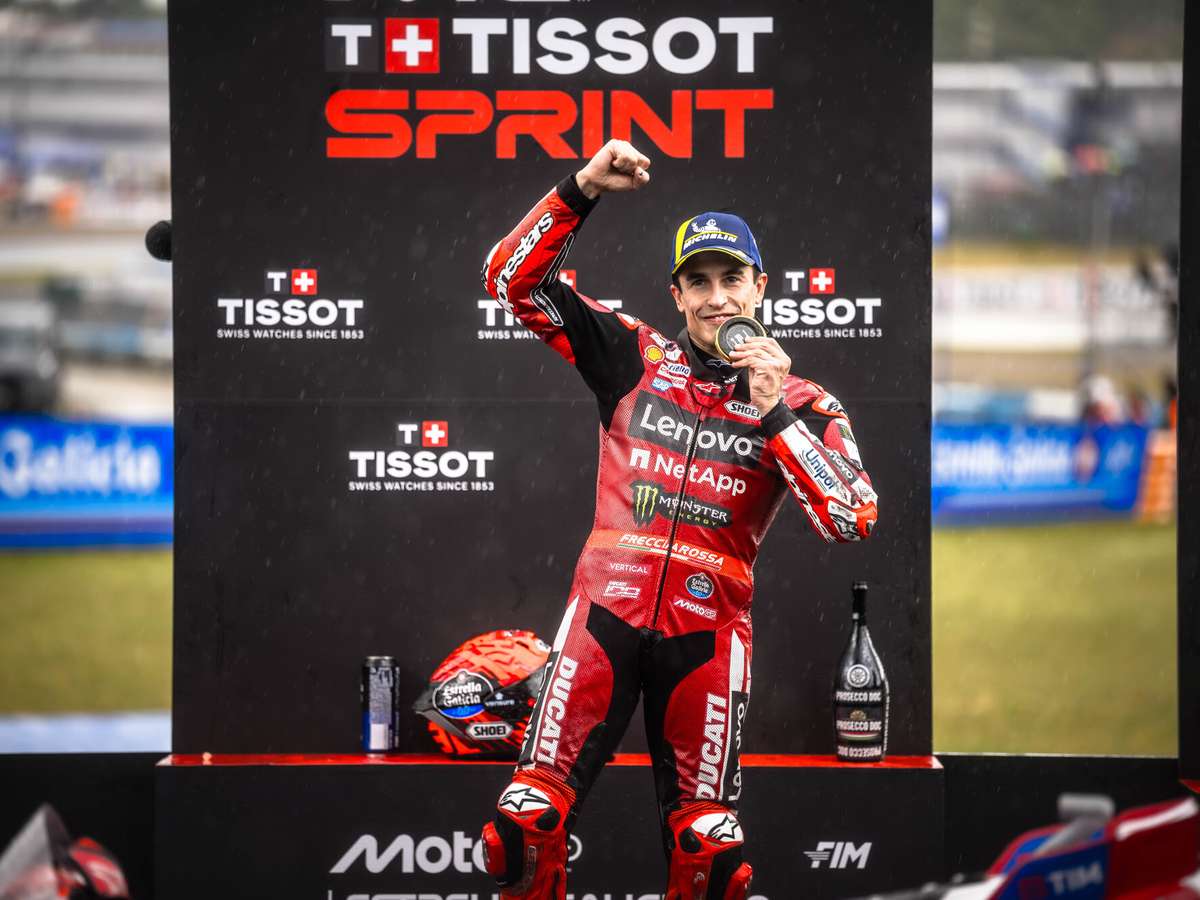 O piloto espanhol venceu a corrida sprint, marcada pela chuva e pelas quedas. Pecco Bagnaia e Morbidelli completam o pódio