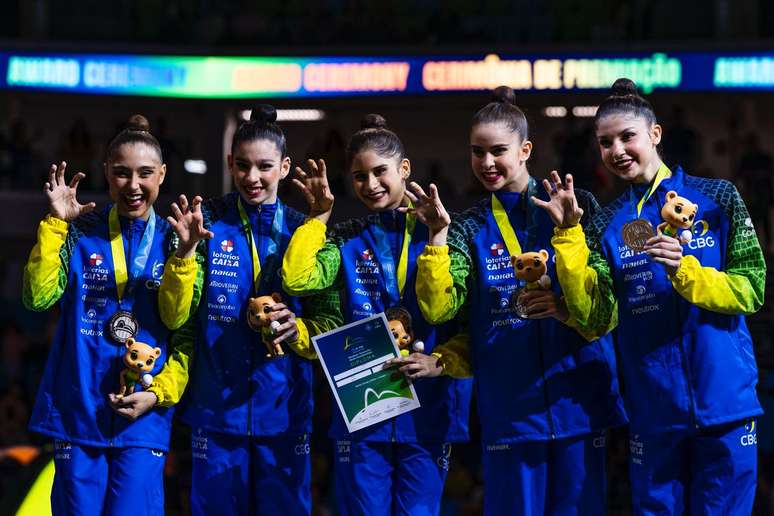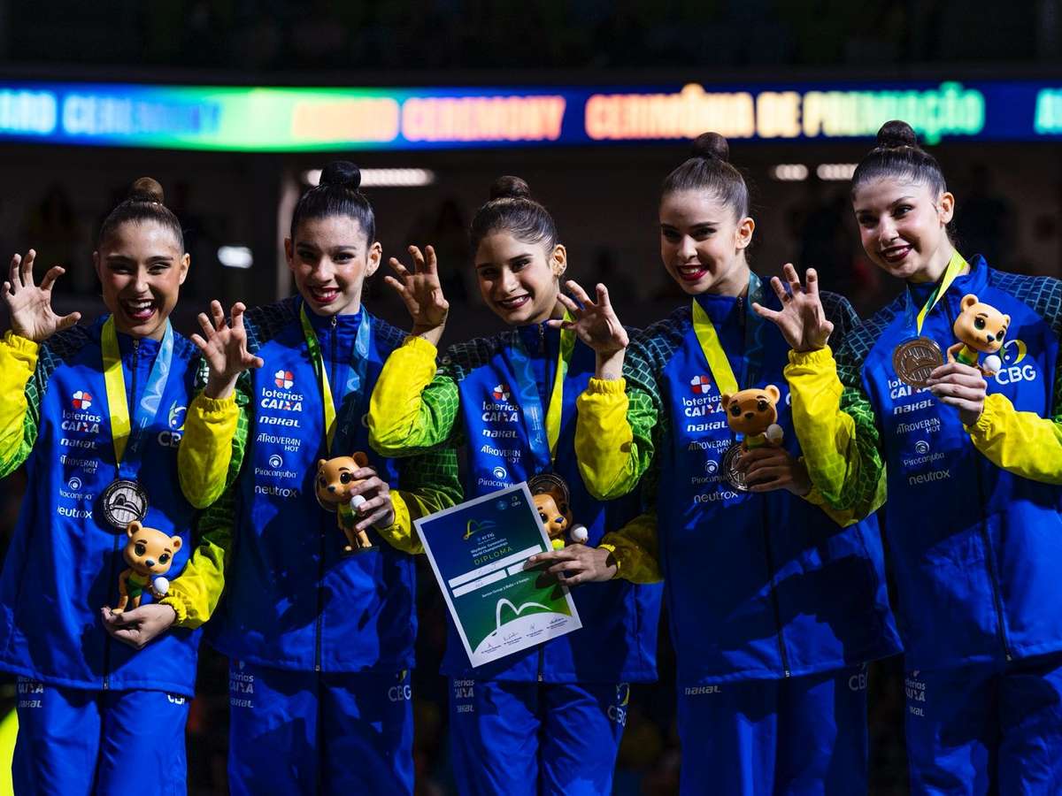 No conjunto, o Brasil viveu dias inesquecíveis diante de uma Arena Carioca 1 lotada e barulhenta, conquistando suas primeiras medalhas em Mundiais da modalidade. No sábado, a equipe formada por Maria Eduarda Arakaki, Maria Paula Caminha, Mariana Gonçalves, Sofia Pereira e Nicole Pircio ficou com a prata no geral, atrás apenas do Japão, e no domingo repetiu o feito ao garantir mais uma prata na final mista com bolas e arcos, ficando a apenas 0,1 ponto da Ucrânia, campeã da prova, em uma apresentação embalada pela música "Evidências" que emocionou a torcida.