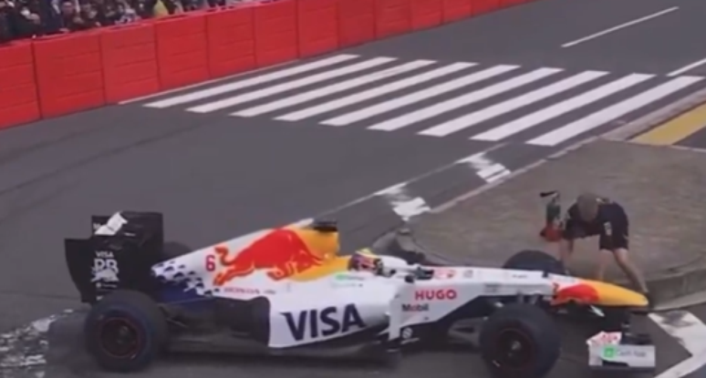 Sem maiores prejuízos, o piloto de 20 anos contou com a ajuda de um mecânico para reposicionar o carro e voltar ao traçado. Em outro momento do evento, ele errou a entrada de uma curva e precisou novamente de ajuda para seguir com a apresentação.