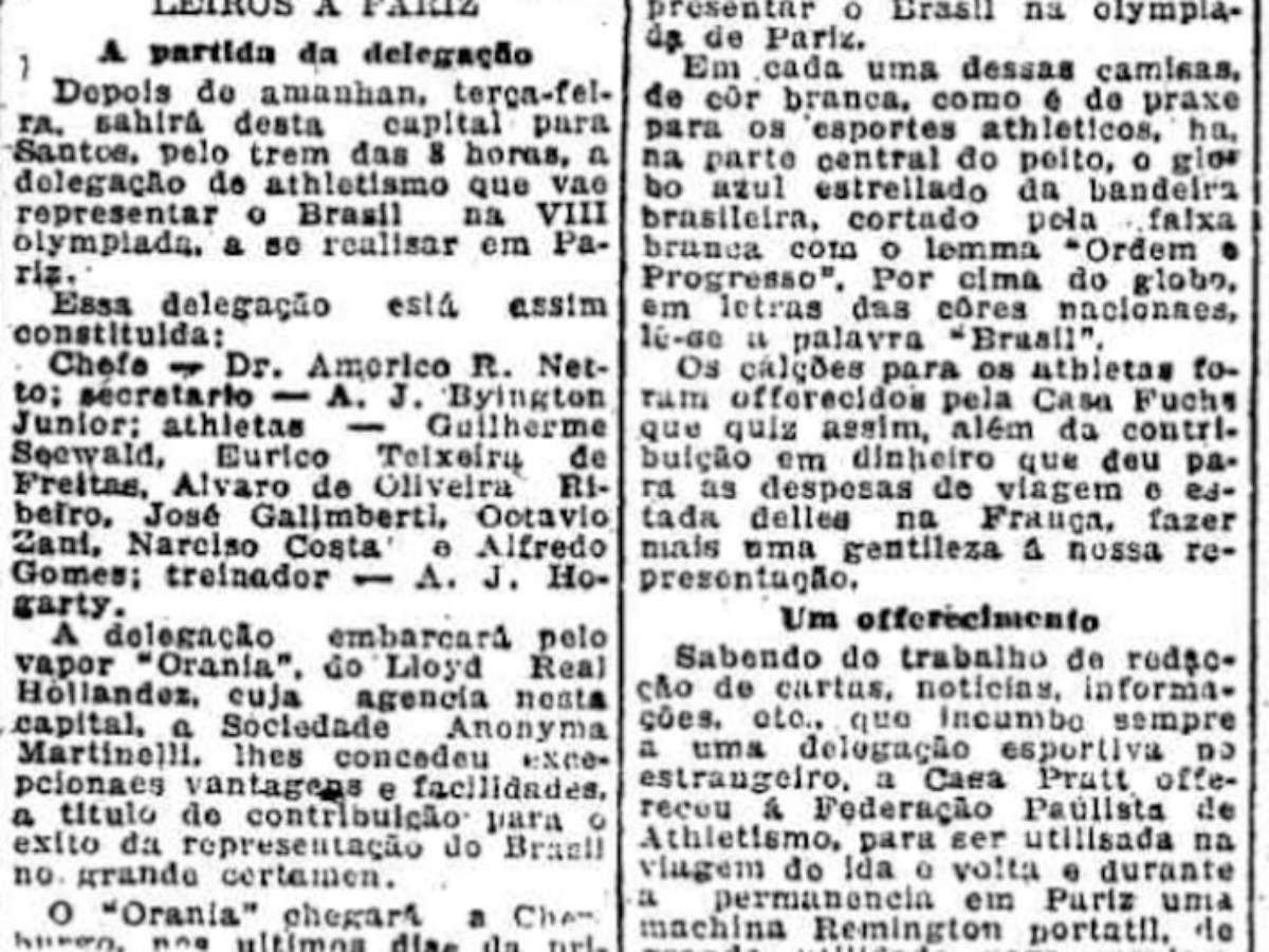 Em 25 de março de 1924, a Confederação Brasileira de Desportos, a CBF da época, desistia oficialmente de levar o futebol à Olimpíada de Paris por falta de recursos. O governo havia prometido 350 contos de réis, mas a verba não foi liberada. A Secretaria da Associação Paulista de Sports Athleticos (APSA) publicou nota oficial sobre o ocorrido. Para que uma delegação brasileira fosse aos Jogos Olímpicos, a recém-criada Federação Paulista de Atletismo (FPA), fundada em 30 de janeiro de 1924, e o jornal O Estado de São Paulo se uniram. FPA organizou a equipe, e o Estadão viabilizou os recursos, contribuindo e fazendo ampla divulgação da vaquinha. Conseguiram concretizar o sonho, com uma delegação olímpica formada praticamente por atletas paulistas do atletismo. Essa façanha é um dos capítulos do livro do centenário da FPA, que está sendo escrito pelo historiador Diano Massarani e que será lançado no segundo semestre.