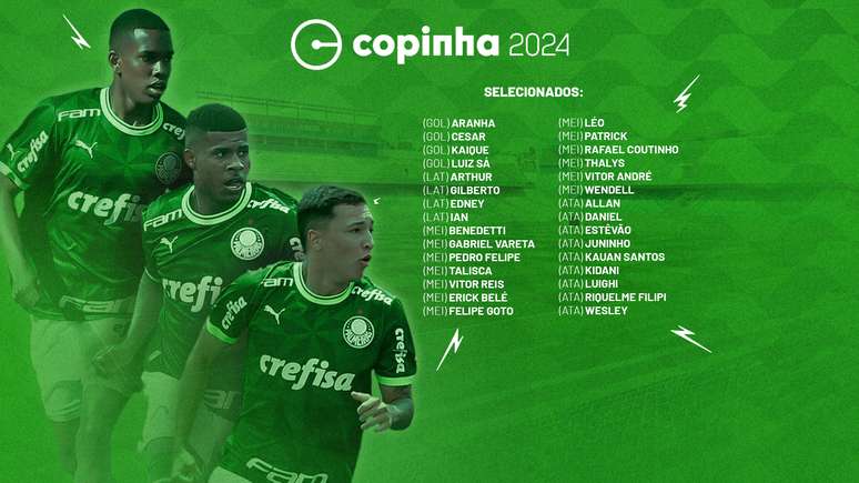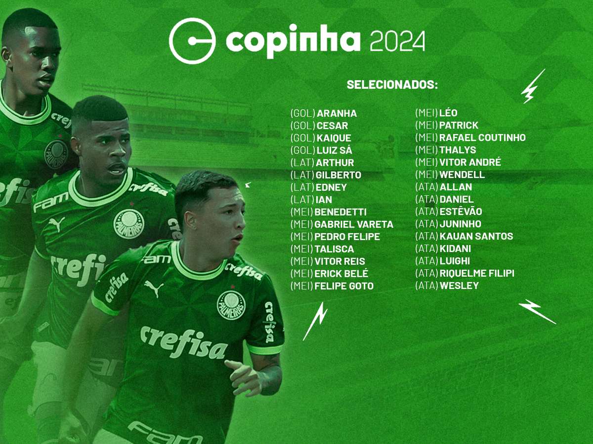 O Palmeiras divulgou nesta quinta-feira a lista dos 30 jogadores inscritos para a Copa São Paulo de Futebol Júnior de 2024. Com a presença de Estevão, de 16 anos e campeão brasileiro pelo profissional em 2023, a equipe comandada por Lucas Andrade vai em busca do tricampeonato do torneio.