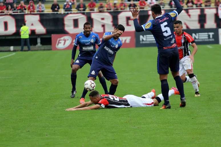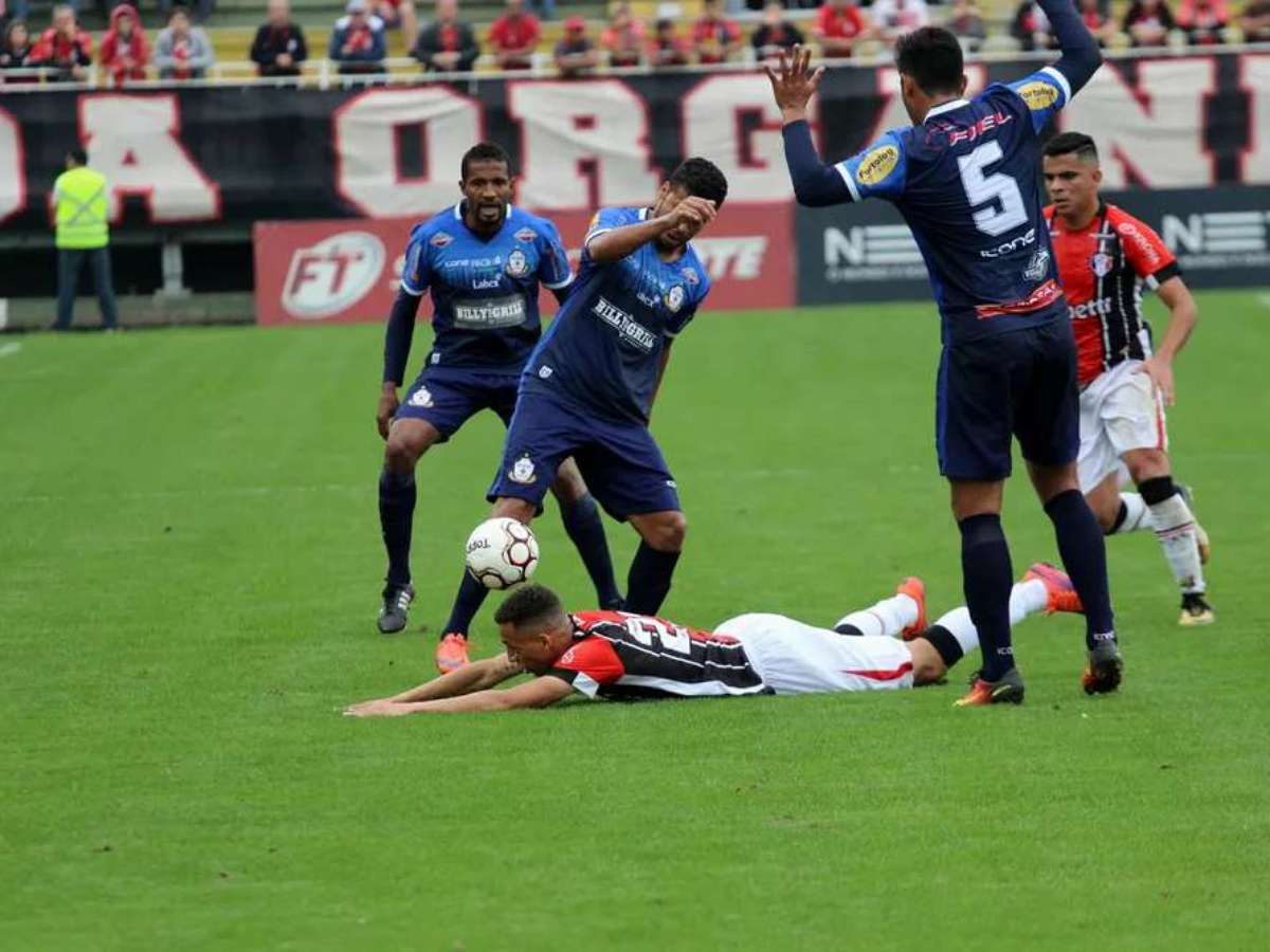 Bruno Rodrigues (à direita) e Breno Lopes (caído à esquerda) em ação pelo Joinville em 2017