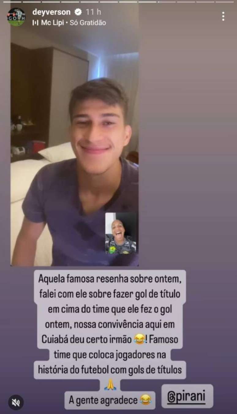 "Aquela famosa resenha sobre ontem. Falei com ele sobre fazer gol de título em cima do time que ele fez o gol ontem. Nossa convivência aqui em Cuiabá deu certo irmão. Famoso time que coloca jogadores na história do futebol com gols de títulos. A gente agradece.", escreveu o jogador, com emojis de risada.
