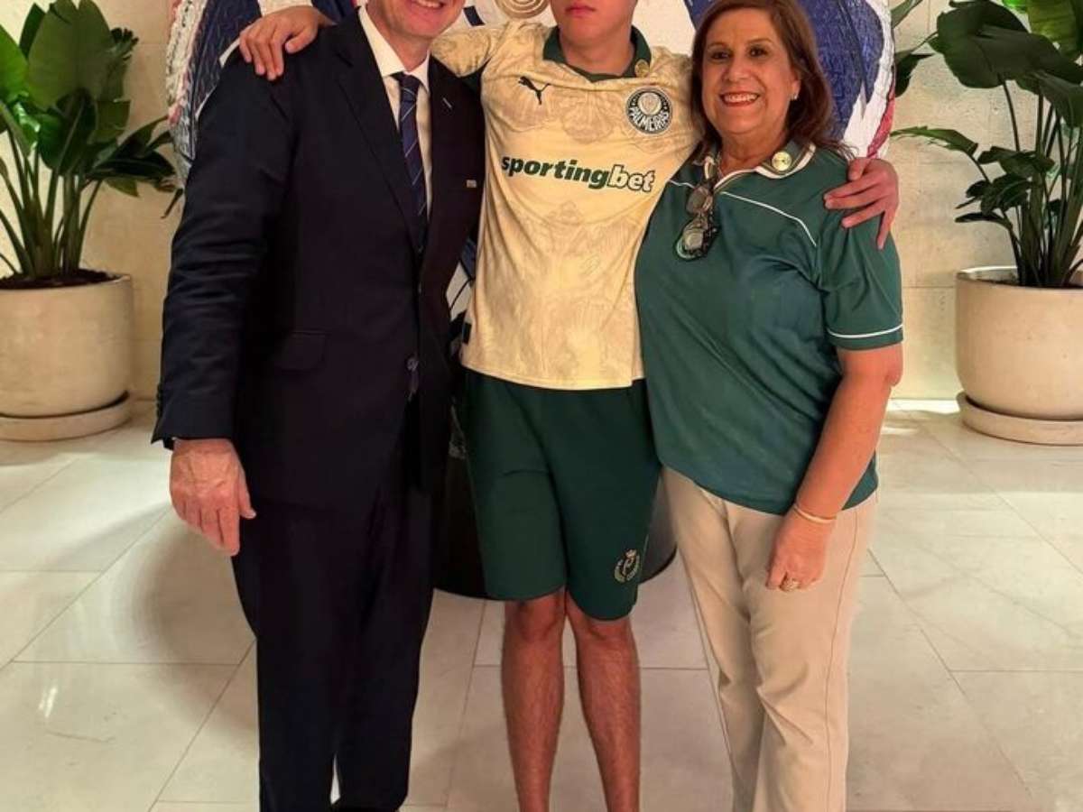 O presidente da Fifa, Gianni Infantino, se encontrou nesta terça-feira em Miami com os brasileiros Silvia Grecco e seu filho Nickollas. A dupla, que está nos Estados Unidos a convite da entidade acompanhando o Palmeiras no Mundial de Clubes, ficou conhecida mundialmente após receber o Fifa Fan Award em 2019, prêmio que reconhece torcedores por sua dedicação e histórias inspiradoras no futebol.