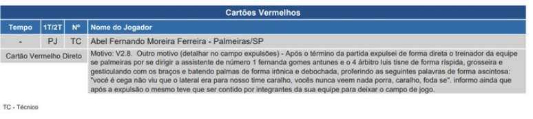 O relato sobre os motivos da expulsão do técnico Abel Ferreira contido na súmula do jogo entre Palmeiras e Fluminense, pelo Brasileirão, não condiz com a realidade dos fatos.