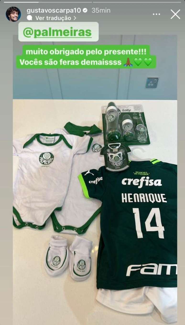 Gustavo Scarpa, ex-jogador do Palmeiras, registrou na última sexta-feira o nascimento de seu filho. Neste domingo, o meio-campista revelou que o nome do menino será Henrique e publicou alguns presentes que recebeu do seu antigo clube ao recém-nascido.