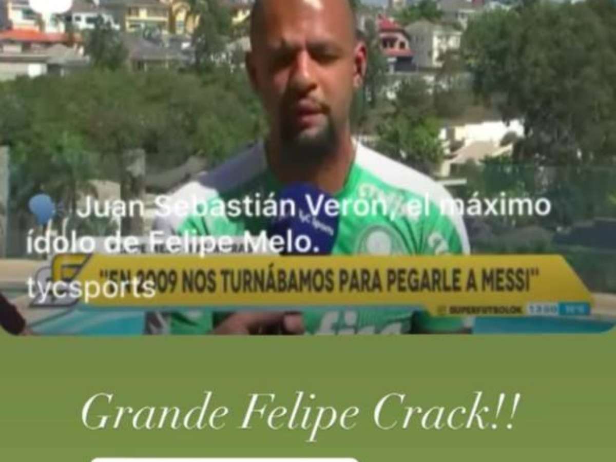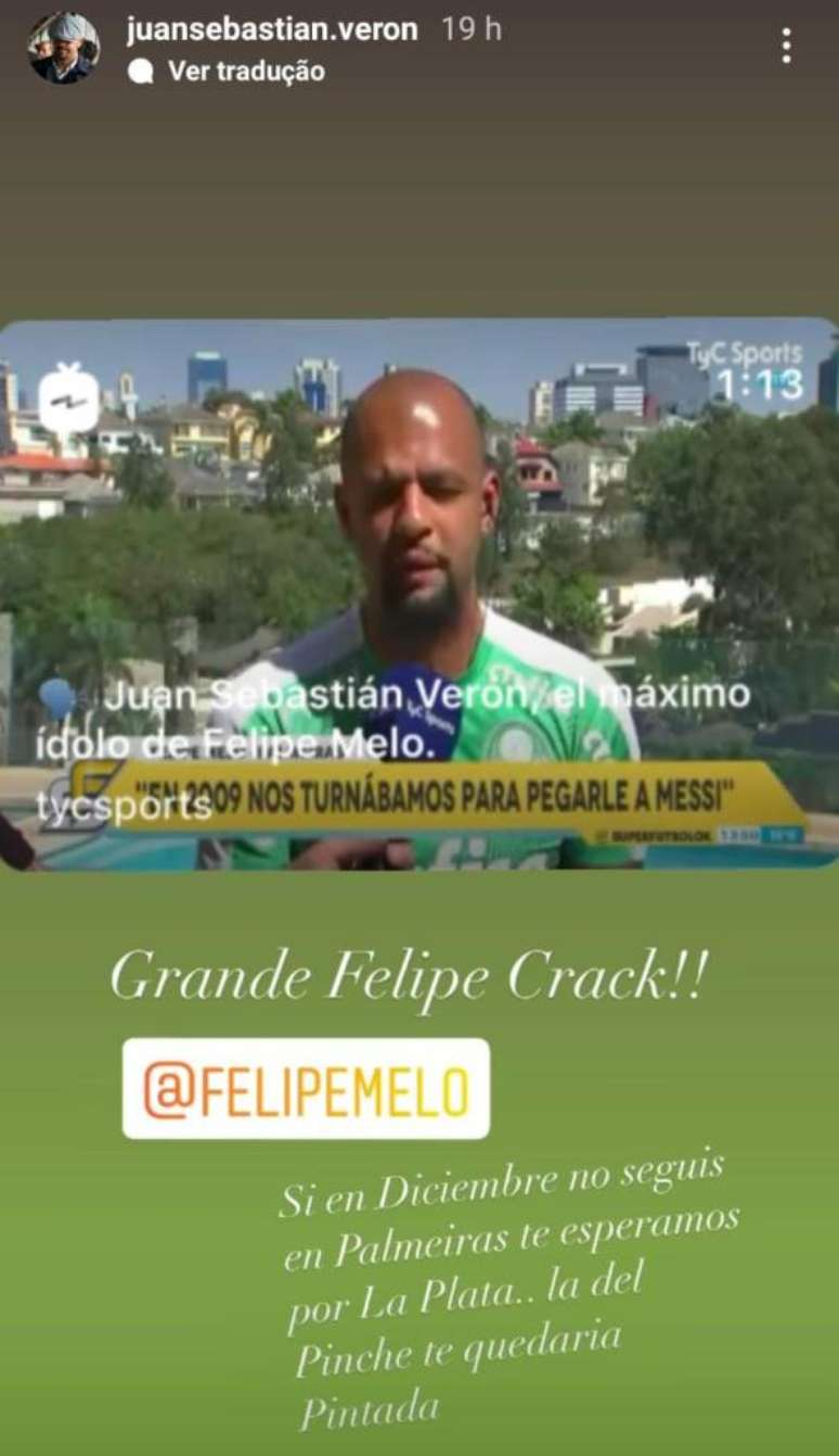 "Grande Felipe Melo, craque!! Se não seguir em dezembro no Palmeiras, te esperamos em La Plata. O Pincha (apelido do clube) estaria enfeitado para você", escreveu Verón.