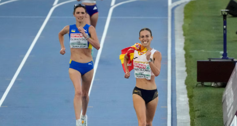 No entanto, a alegria da atleta de 29 anos, que carregava a bandeira da Espanha nos ombros, não durou muito tempo. E ela foi inesperadamente ultrapassada pela ucraniana Lyudmila Olyanovska a poucos metros da linha de chegada.