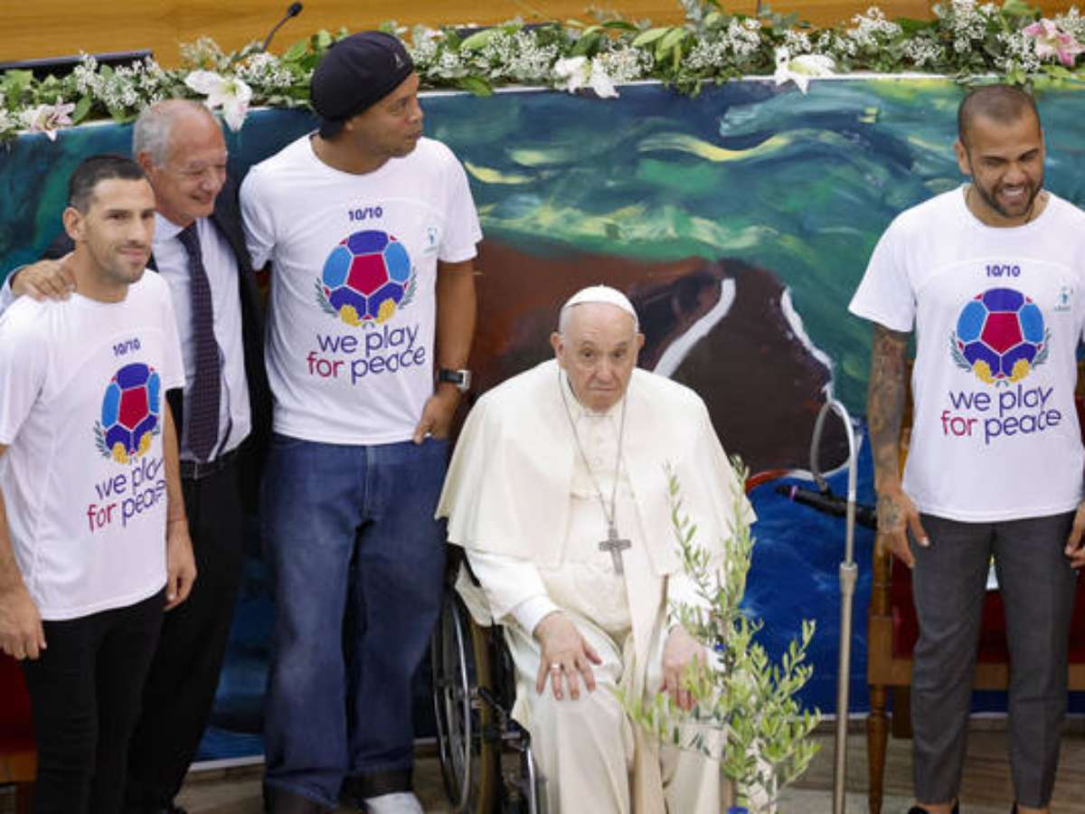 Acompanhado do brasileiro Daniel Alves e do argentino Maxi Rodríguez, Ronaldinho vestiu uma camiseta com a frase "Nós jogamos pela paz" e posou para fotos com o líder católico, que reapareceu em público de cadeira de rodas por causa de dores no joelho direito.