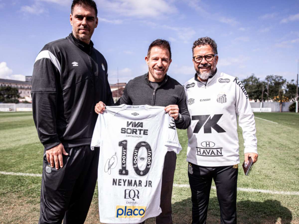 Ex-técnico da Seleção visita treino do Santos e ganha presente autografado por Neymar