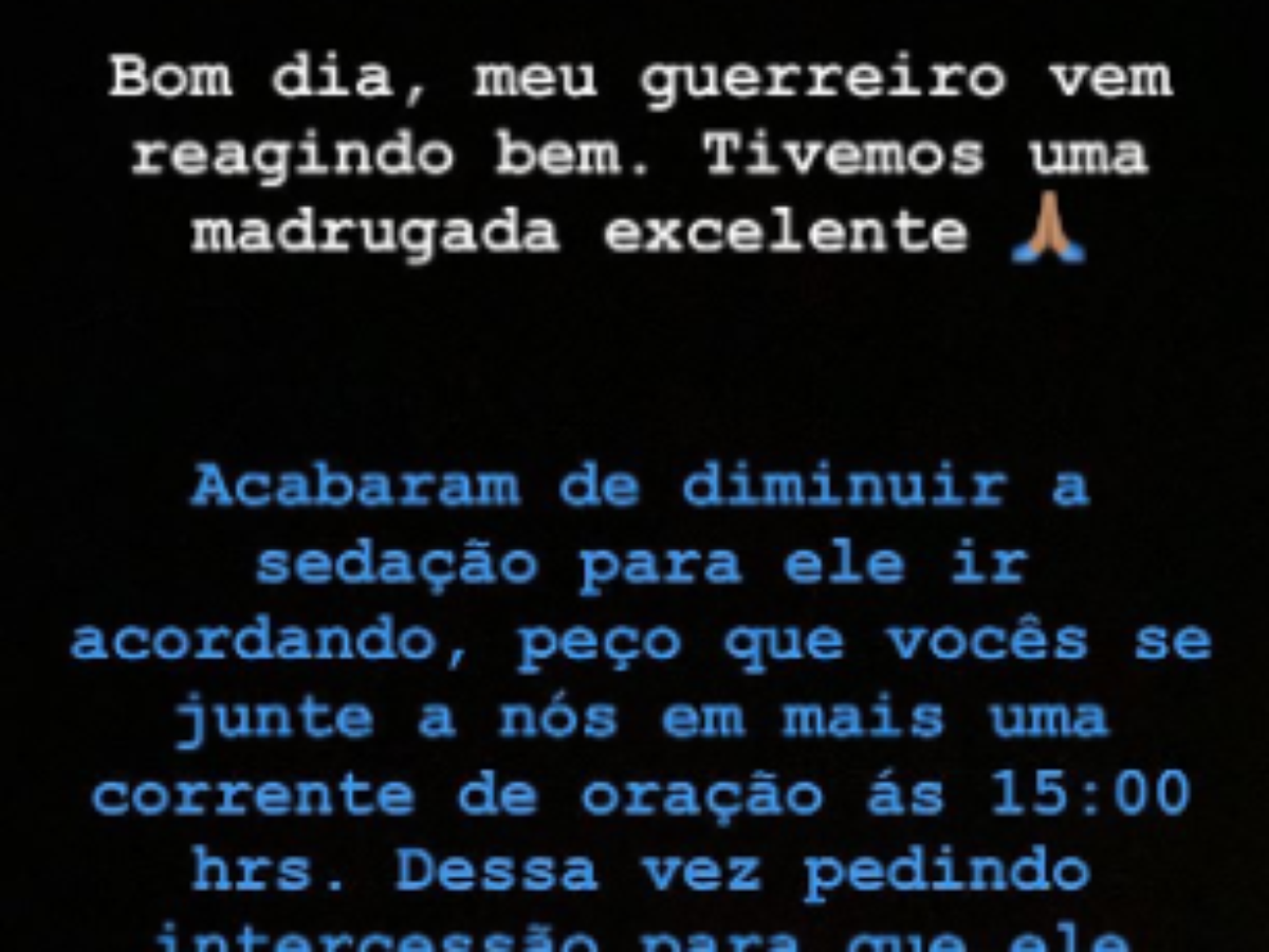 "Bom dia, meu guerreiro vem reagindo bem. Tivemos uma madrugada excelente. Acabaram de diminuir a sedação para ele ir acordando", publicou Aline.