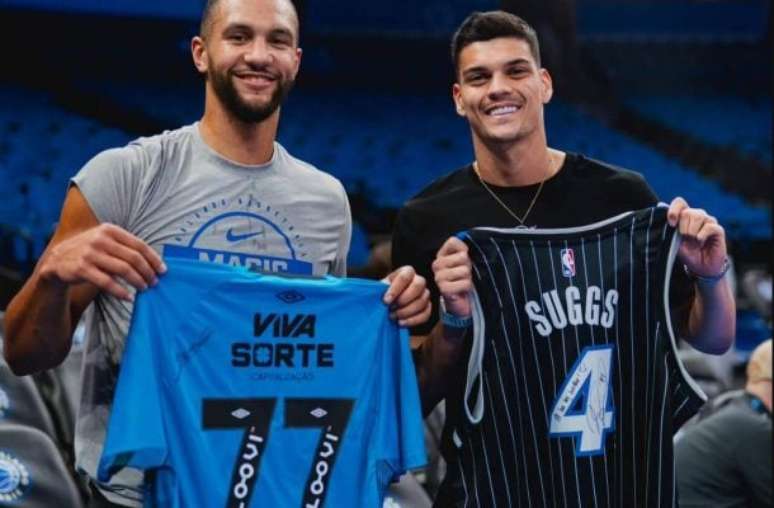 Gabriel Brazão compareceu ao jogo do Orlando Magic e deu uma camisa do Peixe ao armador Jalen Suggs