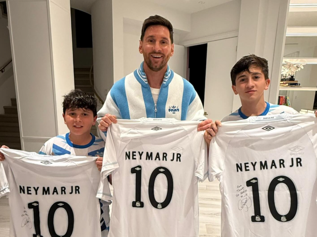 Messi e os filhos Tiago e Mateo foram presenteados, cada um, com uma camisa 10 do Santos, autografada por Neymar.