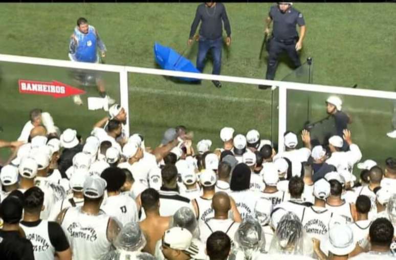 Contudo, um ato lamentável também marcou o jogo. A violência de alguns torcedores durante o intervalo. Arruaceiros de Remo e Santos começaram uma briga e a polícia chegou para intervir. Pórém, a torcida do Santos quebrou um dos vidros que separam o público do gramado, o que aumentou a tensão com os policiais. Além disso, rolou também entrevero entre membros da própria organizada santista. Já os remistas foram colocados em outro espaço para evitar novos confontos. Isso atrasou o início do segundo tempo em cinco minutos.