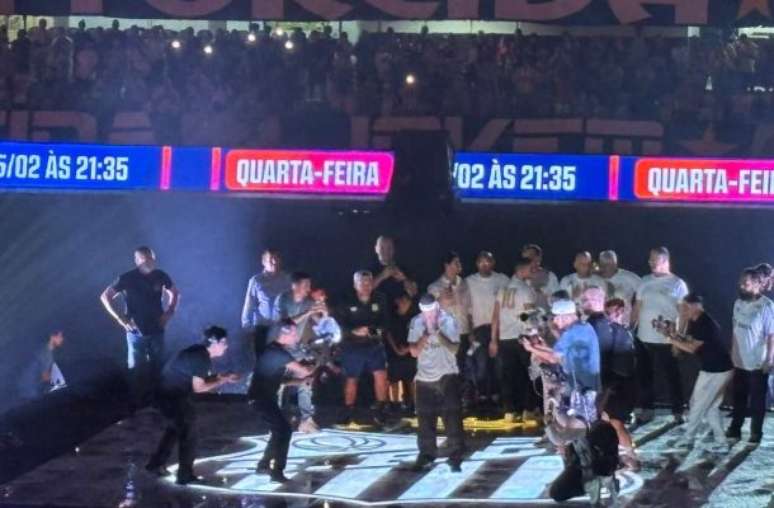 Nos vestiários, Neymar escreveu a frase "eu fui, mas voltei". Depois, ajoelhou-se, fez uma oração e subiu as escadas de mãos dadas com Edinho, filho de Pelé, e o presidente Marcelo Teixeira. Com as luzes apagadas e um show nas arquibancadas, o craque subiu no palco montado no meio de campo com a camisa 10.