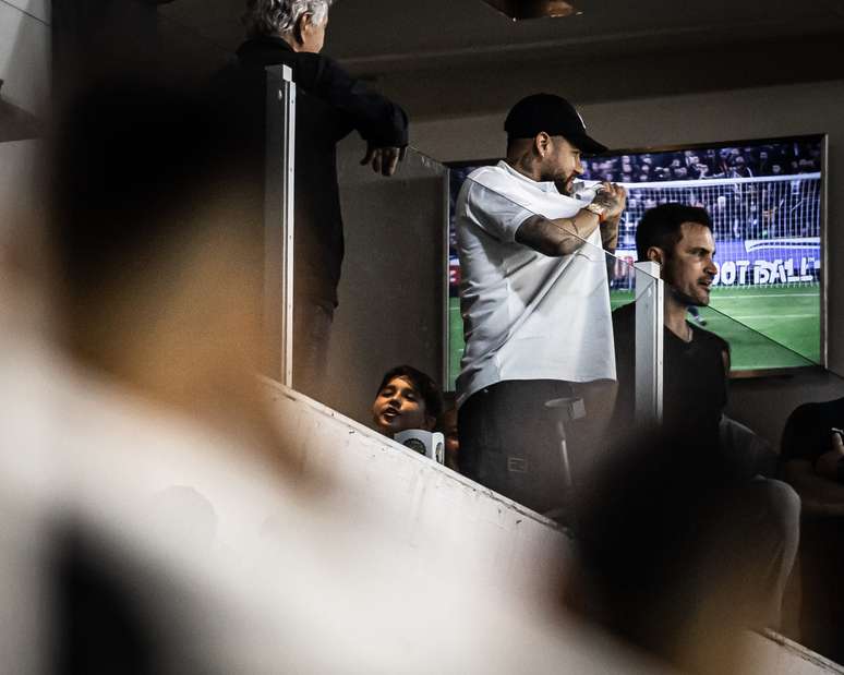 Logo quando chegou à Vila, Neymar rapidamente se dirigiu aos camarotes e vestiu uma camisa do Santos, semelhante ao modelo antigo usado pelo Rei Pelé. O jogador do Paris Saint-Germain foi ovacionado pelos torcedores, que entoaram gritos com seu nome e pediram seu retorno.
