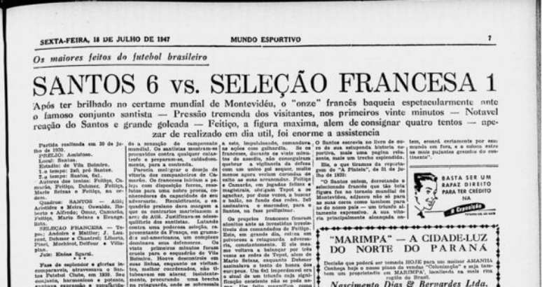 O Santos enfrentou a seleção da França em 30 de julho de 1930, logo após a primeira edição da Copa do Mundo, realizada no Uruguai. E goleou por 6 a 1.