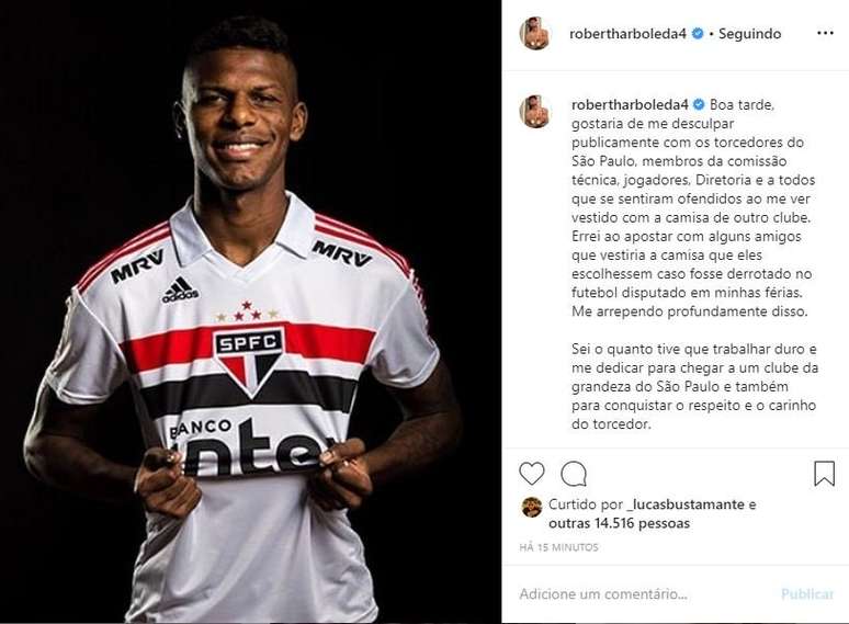 "Gostaria de me desculpar publicamente com os torcedores do São Paulo. membros da comissão técnica, jogadores, diretoria e a todos que se sentiram ofendidos ao me ver vestido com a camisa de outro clube. Errei ao apostar com alguns amigos que vestiria a camisa que eles escolhessem caso fosse derrotado no futebol disputado em minhas férias. Me arrependo profundamente", diz parte da postagem do equatoriano.